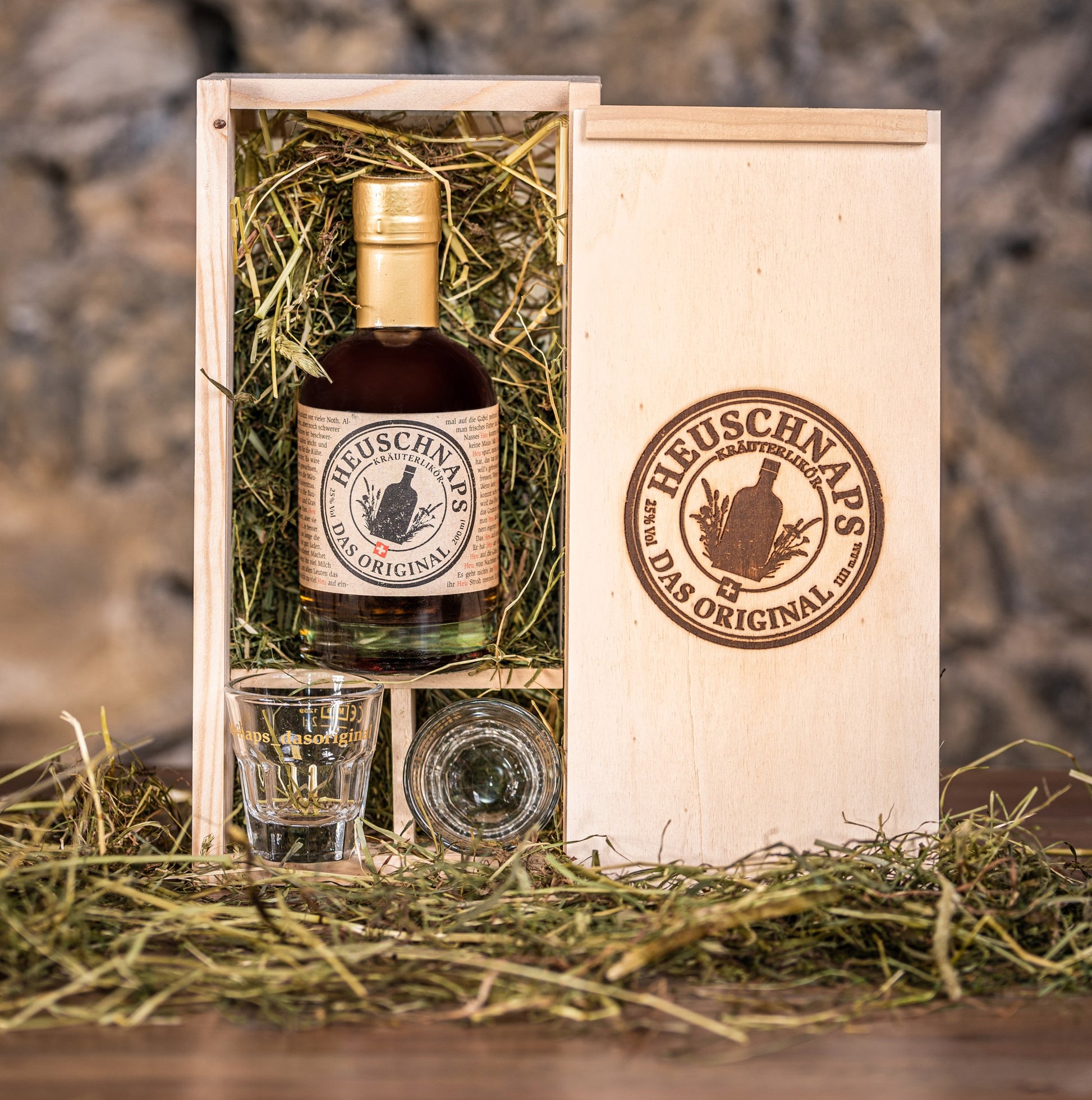 Der legendäre Heuschnaps in der Holzbox plus 2 Shot-Gläser – alles hübsch auf Heu gebettet.